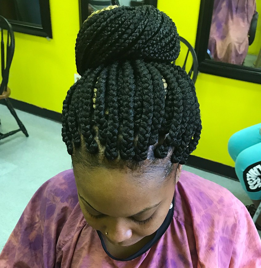 Big braid hairstyles often feel heavy when worn loose. Throw your braids up in a bun for those days when you don’t have to worry about long braids flapping against your back. A bun is always the right, polished look for a formal event or meeting at the office.