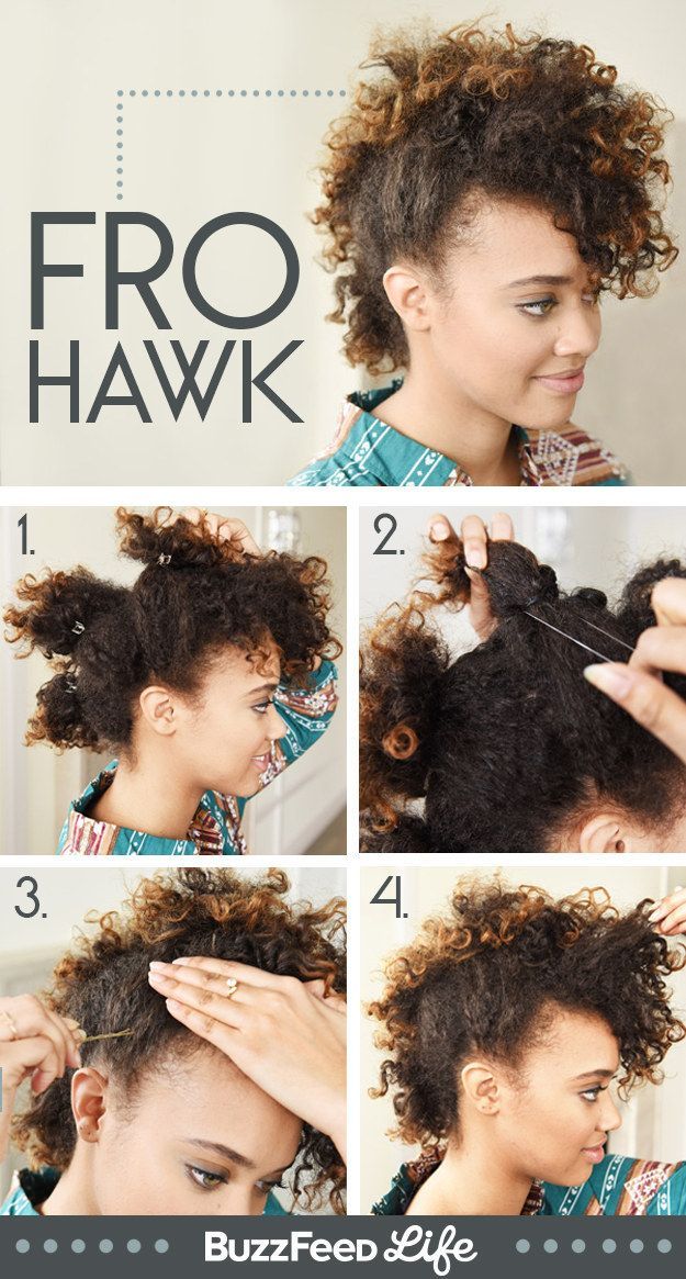 This curly frohawk is a great quick style for short natural hair. Start with a wash and go (it can even be an old wash and go), part the hair along the sides and use a non-flaking gel to slick the hair down.